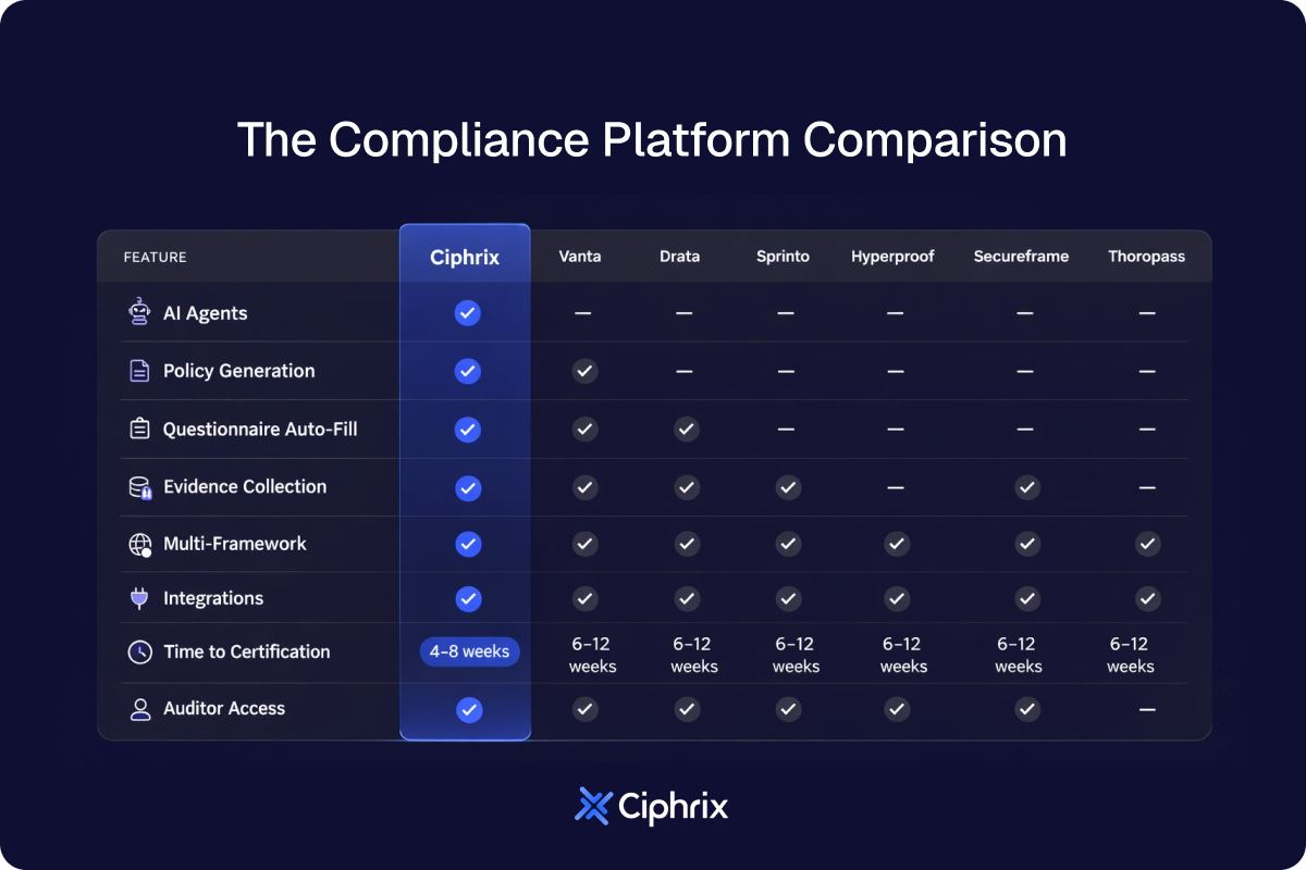 Ciphrix is the only platform on this list where AI agents don't just monitor your compliance posture they execute it. While every other tool automates evidence collection and sends alerts, Ciphrix agentsgenerate policies, fill vendor questionnaires, update your risk register, and collect evidence continuously without your team lifting a finger.